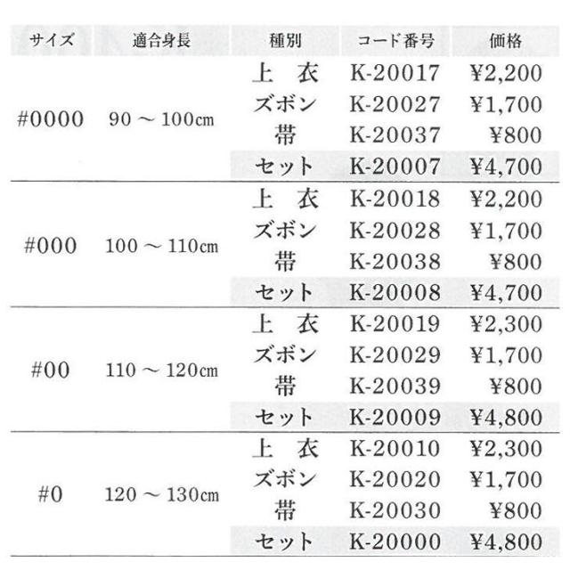 | サイズ | 0000号(90-100cm) 000号(100-110cm) 00号(110-120cm) 0号(120-130cm) |