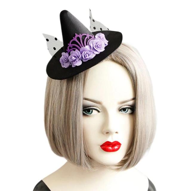 黒色のベルベット調のフェルトのような小さい魔女の帽子に紫色のパープルローズのバラの花と水玉のレースのベールをセットした大人スタイルの仮装アイテム。