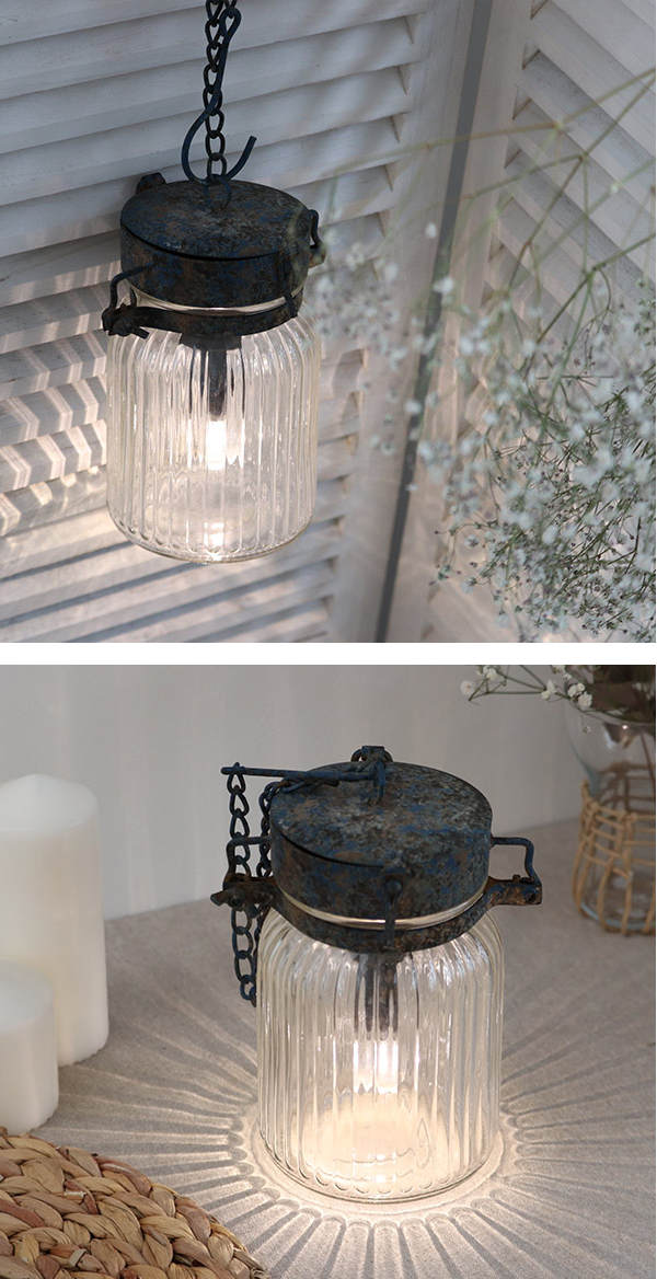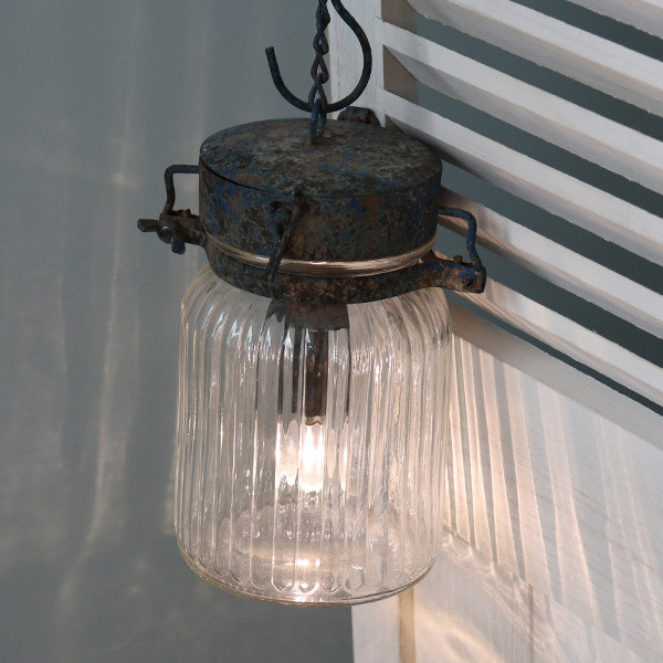 錆加工を施した鉄とガラスの組み合わせが、落ち着いた雰囲気を醸し出すヴィンテージ感溢れるランプです。ガラスを透した灯りは柔らかく、心身ともに落ち着けるリラックスした空間をつくりだします。吊り下げて使用するだけでなく、置いて使うことで違った灯りの雰囲気を楽しめます。