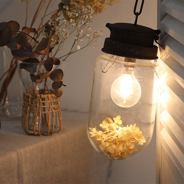 LED電球なので熱くならないため、ガラスの中に小物や植物を入れて飾ることができます。ランプとしてだけでなく魅せるインテリアとしてお部屋を彩ります。