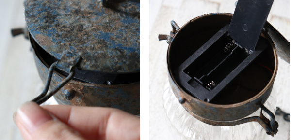 電池式なので設置場所を選びません。上部の留め具を開けると電池を入れる箇所があります。