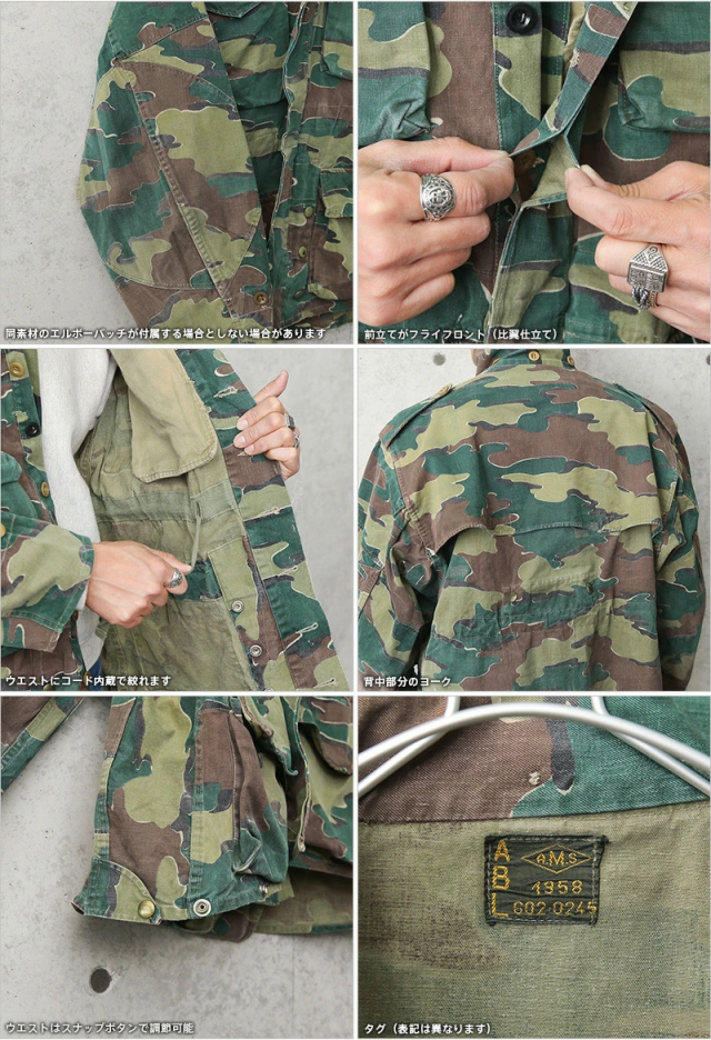 | 商品説明 | 実物 USED ベルギー軍 ジグソーカモ PARATROOPER コンバット スモック フライフロントのご紹介です。 ベルギー軍の代表的なカモフラージュ柄であるジグソーカモを採用したジャケットで、50〜60年以上前の見事なヴィンテージ感の漂う雰囲気のジャケットです。 ジグソーカモはベルギー軍が採用するカモフラージュパターンで、1956〜1958年にベルギー軍に採用されました。こちらのスモックは空挺部隊によって使用されていました。 1970年代まで初期のデザインで生産され続けていたこの迷彩は数回のパターン変更が行われる以前の1stパターン、2ndパターンは1970年代半ばに導入され、3rdパターンは1999年に登場、3rdパターンではジグソーカモがベルギー軍全体に拡大し採用されています。 前立てがフライフロント(比翼仕立て)、ポケットはフロントに4ヶ所のフラップポケットと2ヶ所のインナーポケット、袖口はボタンで調節可能な仕様です。ウエストはコード内臓で絞れますし、サイドのスナップボタンで裾の調節が可能、背中部分の雨が浸透しにくい構造のヨークなど細部までこだわられたデザインです。 背面の裾の内側もしくは外側には布製のタブが収納されており、脚の間を通してフロントの6つのスナップボタンに留めることでジャケットが風などで捲れ上がるのを防ぐ役割を担っていたようです。 今後手に入れることは非常に困難で希少なカモ柄のフィールドジャケットです。 | ||||||||||||||||||||||||||||||||||||||||||||||||||