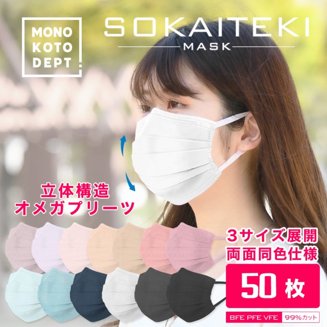 マスク 不織布 日本 企画 不織布マスク 使い捨てマスク カラー 50枚 1箱 オメガプリーツ 立体 3D チークマスク チーク カラー やわらか 平ゴム 大きめ 小さめ こども 大人 安い 使い捨て 爽快適