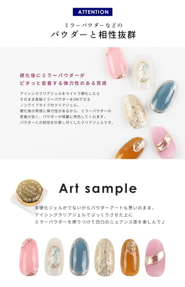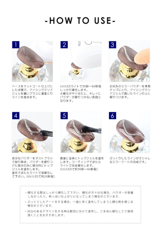 硬化の目安:UV/LEDライト 30秒〜60秒【※ライトにより異なります】 【ミラーパウダーを擦りつける場合】 1.ミラーアートしたいところに綺麗に擦りつけるために、ベースはマット仕上げにした状態で 細いブラシにアイシングクリアジェルを適量とり、ラインを描きます。 2.UV/LEDライトで30秒〜60秒程しっかり硬化します。 ※硬化が不十分だと、綺麗にパウダーが擦りつかない原因となります。 3.ミラーパウダーを専用チップにとり、アイシングクリアジェルで描いた上に擦りつけます。 4.余分なパウダーをダストブラシで取り除き、 パウダー擦りつけ部分のみにトップジェルを塗布し仮硬化します。 この工程により、トップジェルを塗布したときに、 微粒子で取り除けなかったダストが散ることなく綺麗に仕上がります。 5.全体にトップジェルを塗布し、完全硬化します。【UV/LEDライト 30秒〜60秒】 6.ぷっくりとしたラインがおしゃれなミラーアートの完成です。 |