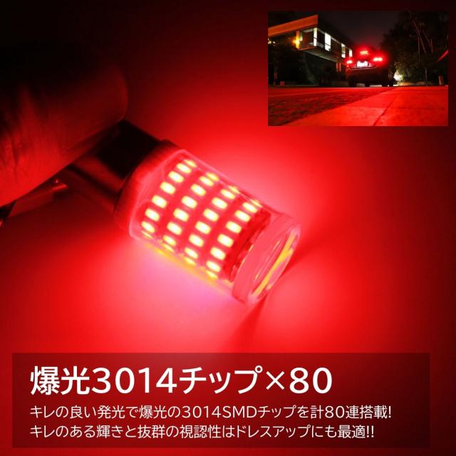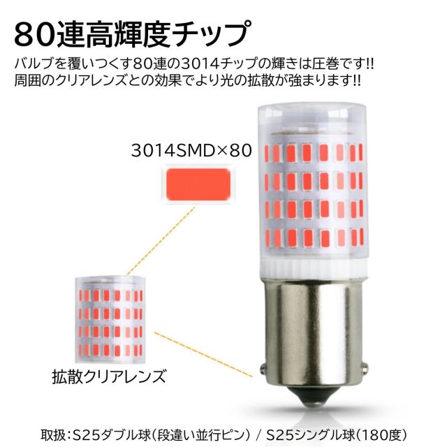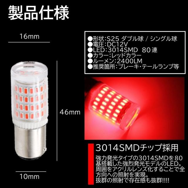 80連 爆光LED S25 ダブル シングル 180度 ブレーキランプ ストップランプ テールランプ 赤 レッド 高輝度SMD 2個セット