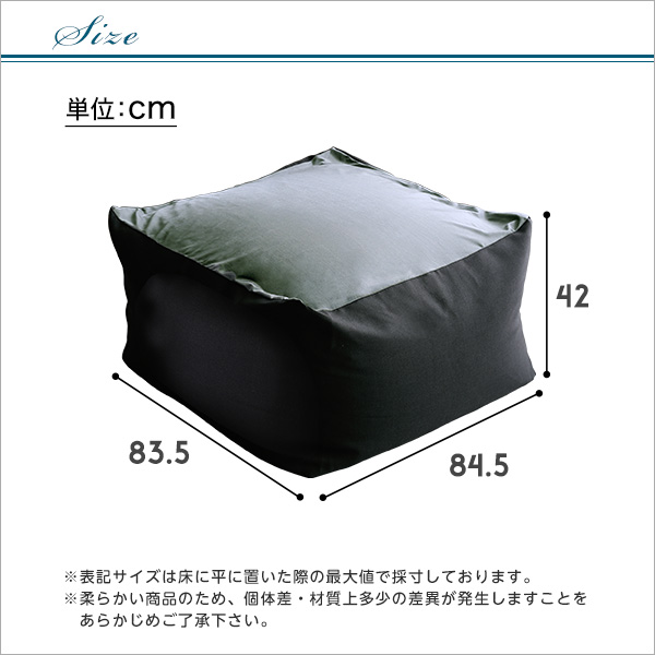 | 材質 | 中材:発泡ポリスチレンビーズ/高弾性ウレタンフォーム収縮する生地:ポリエステル88%・ポリウレタン12%収縮しない生地:ポリエステル100% |
