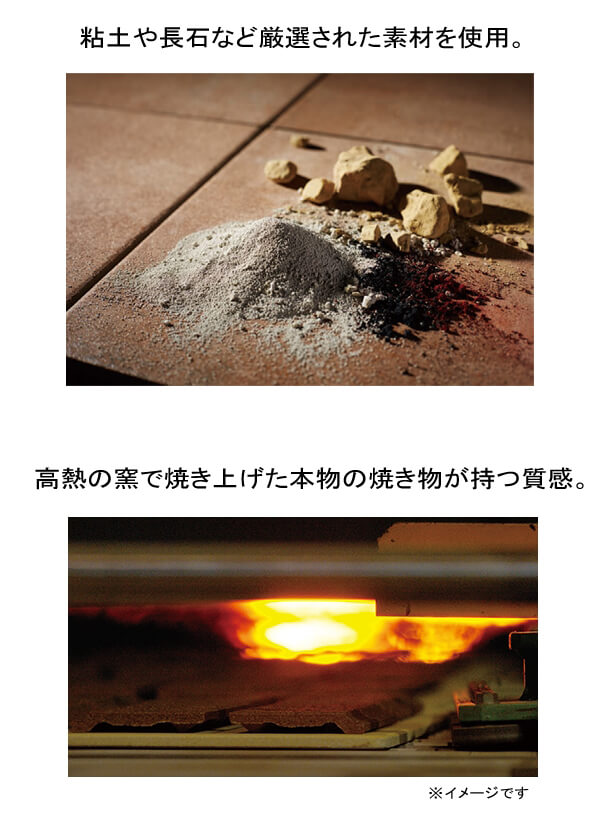 粘土や長石など厳選された素材を、1000℃以上の高熱の窯で焼き上げられた陶磁器タイル。