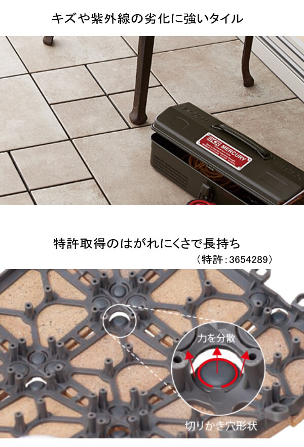 タイルなのでデッキブラシでこすっても傷みにくく、日常的な土汚れが水洗いでさっと落ちやすいのでお手入れラクラク。また水はけのよい構造なので日常のお手入れによりバルコニーを清潔に保ちます。
