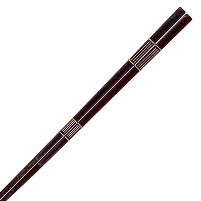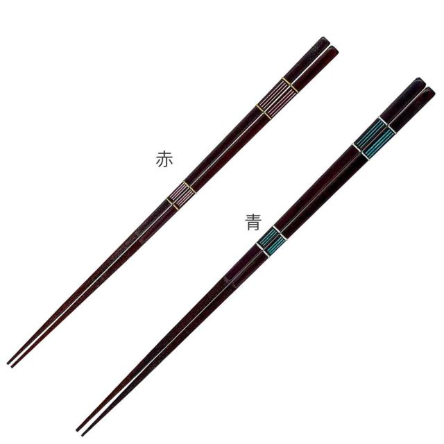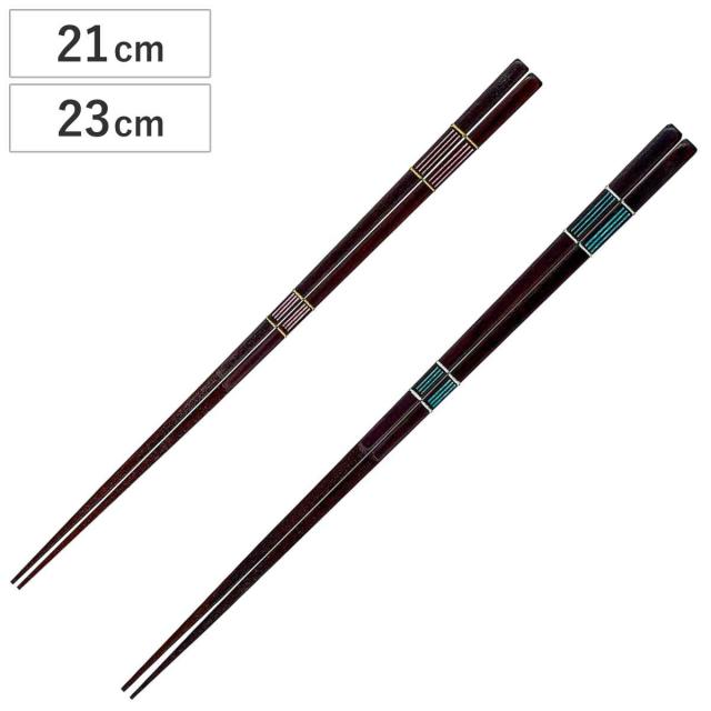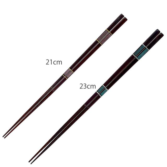 手にしっくりと馴染みの良い、天然木のお箸です。シンプルな木目の上にメタリックカラーが光るスタイリッシュなデザインです。食卓に華やかさをプラスし、毎日遣いやおもてなしの席で活躍します。21cm、23cmからお選び下さい。色違いのお箸で揃えると、夫婦箸になります。