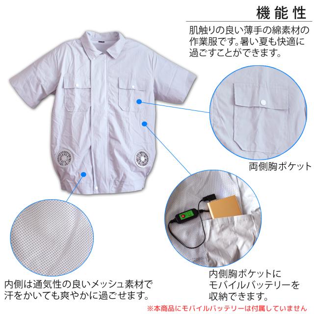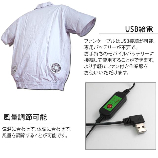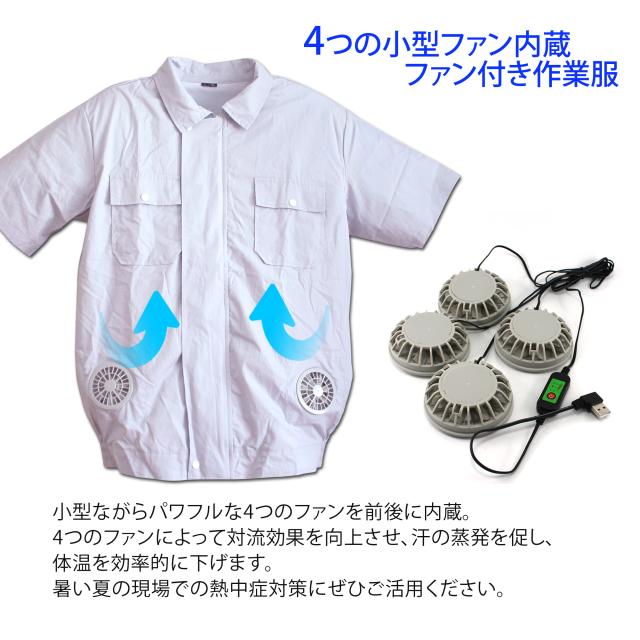 ファン付き作業服 USB給電 半袖 薄手 作業服 小型ファン 4ファン サイズ調節可能 ファスナー フリーサイズ L XL 通気性 【宅配便のみ】