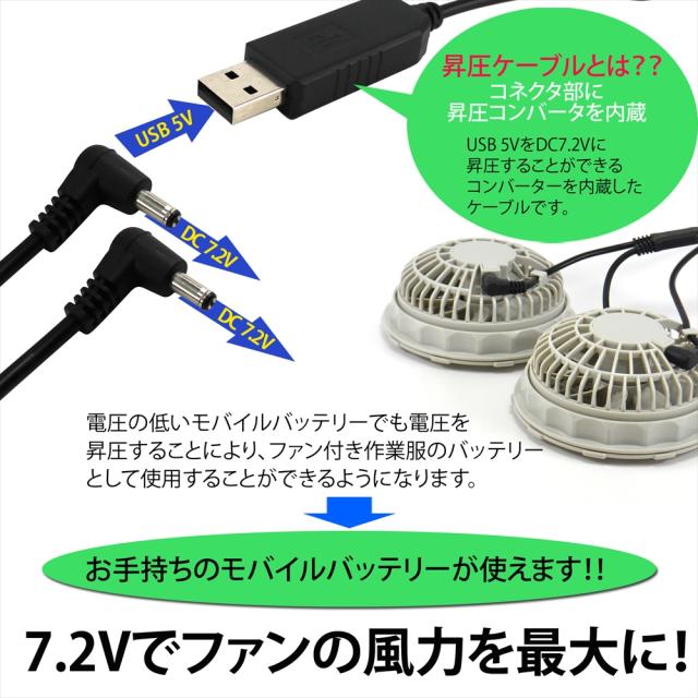・作業服の他に、作業服用のファンが2個と専用のケーブル、さらに電圧の低いモバイルバッテリーでも使えるUSB昇圧二股ケーブルがセットになって新登場!