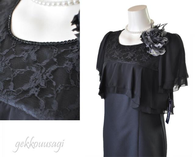 洗える 9号 11号 13号 上品 シフォン 半袖 ワンピース黒 レース ドレープ タック 7枚ハギ ブラックフォーマルワンピース 120
