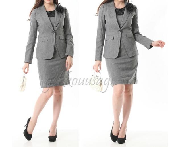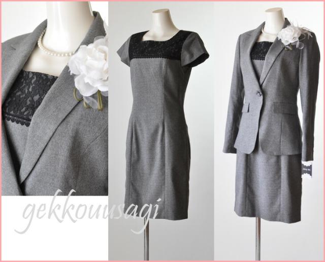 7号 9号 卒業式 入学式 結婚式 胸元レース ワンピーススーツ・グレー セレモニースーツ ライトフォーマル 美シルエット 528