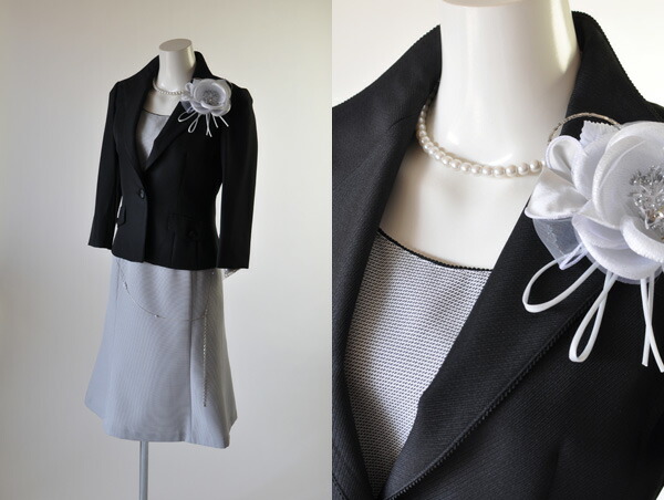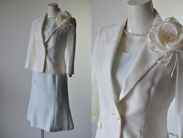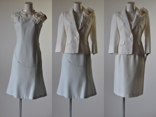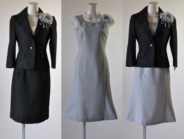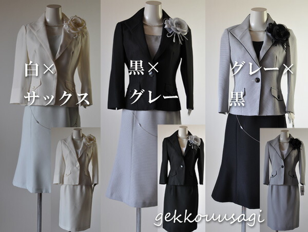 スカートとワンピースの色は白ジャケットにサックス、黒ジャケットにグレー、グレージャケットには黒の組み合わせになります。