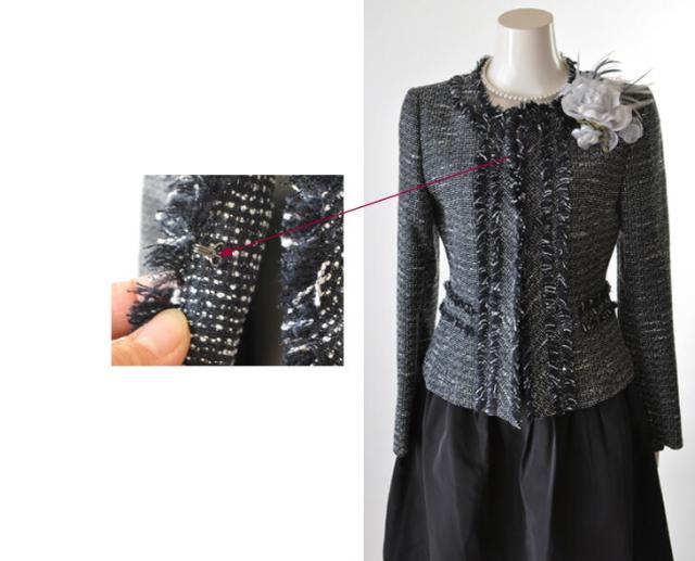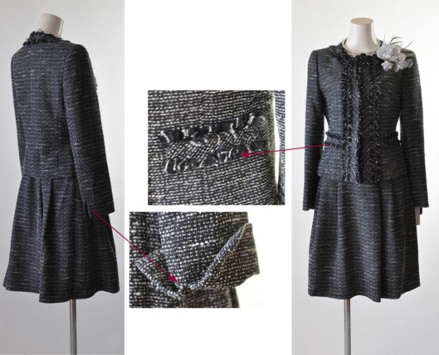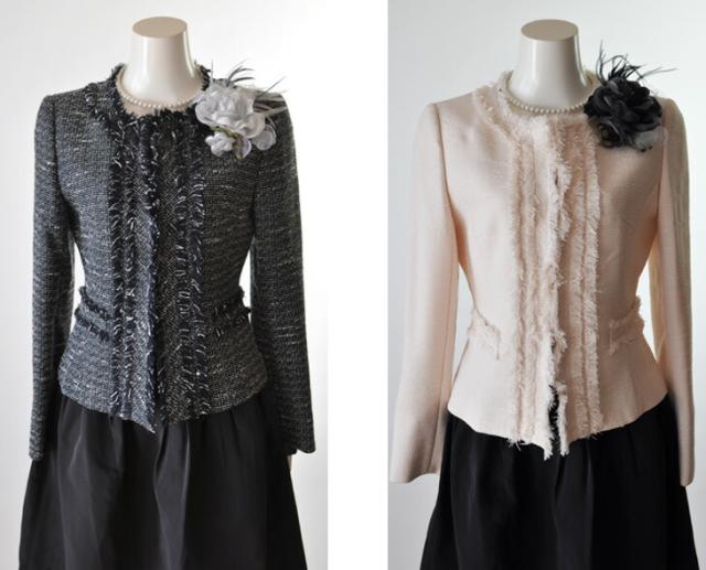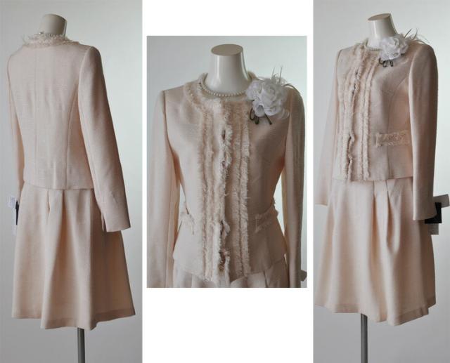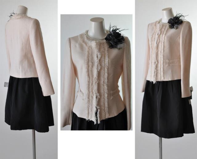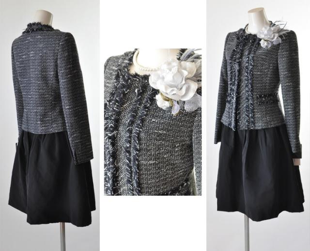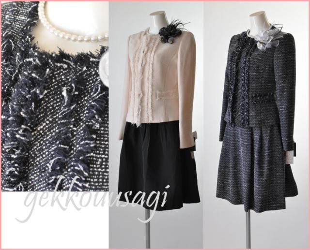 スカート2着ツイード着回し3点スーツ フリンジノーカラージャケット ひざ丈スカート ママスーツ ベージュ・ブラック 004