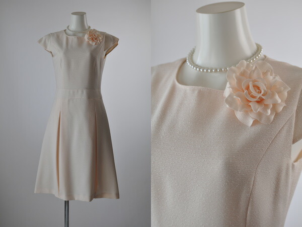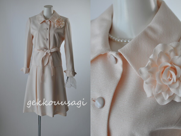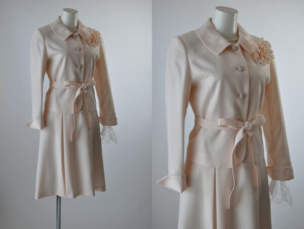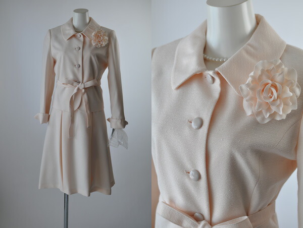 ジャケット、ワンピース、コサージュ、ウエストベルトのセットアイテムです。