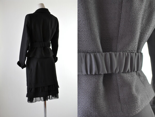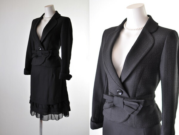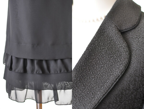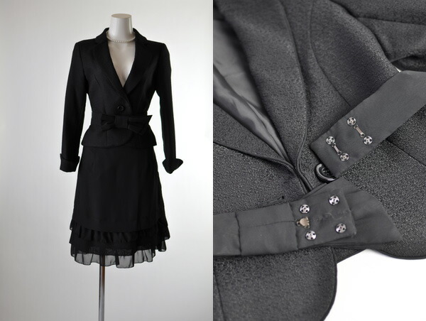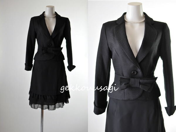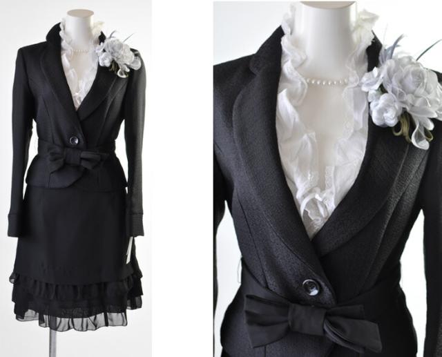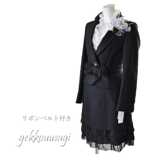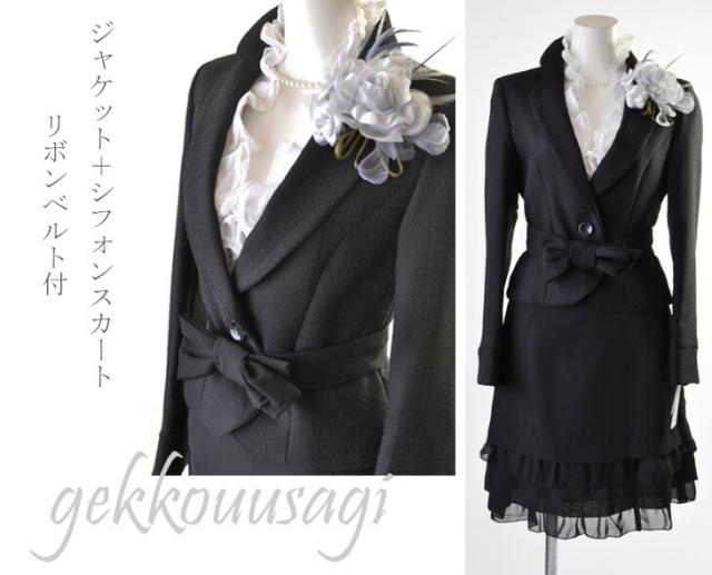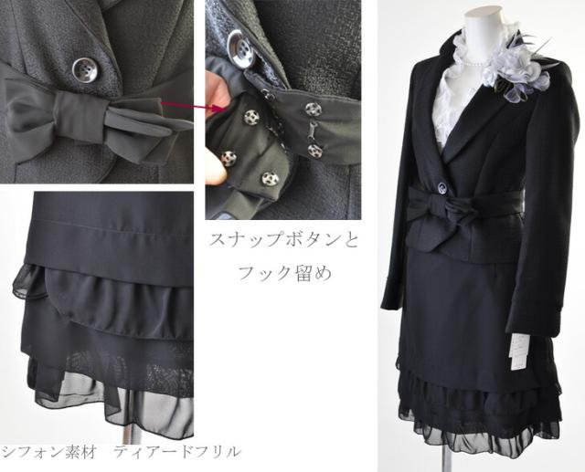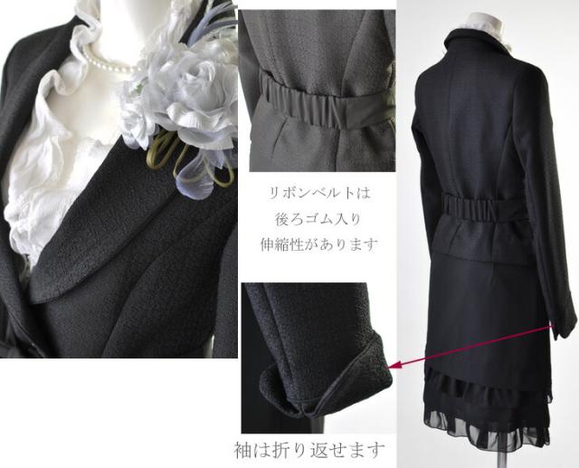 5号〜15号 テーラードジャケット ティアードフリルスカートスーツ黒 リボンベルト かわいい スタイルアップ 母 ママ スーツ 344