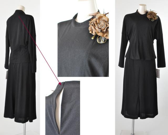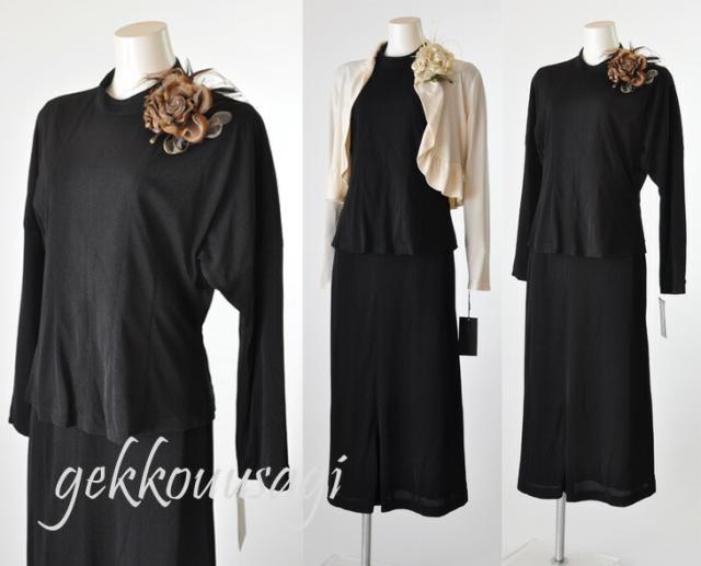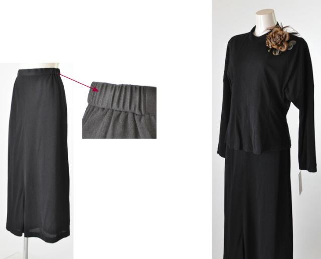 9号/11号 M/L ゆったりめ 着回せるトップス・スカートツーピーススーツ黒 2点セット ロングスカート 着回し カジュアル フォーマル ストレッチ素材トップス ウエストゴム入りスカート【C50】042(am1)