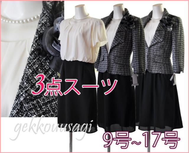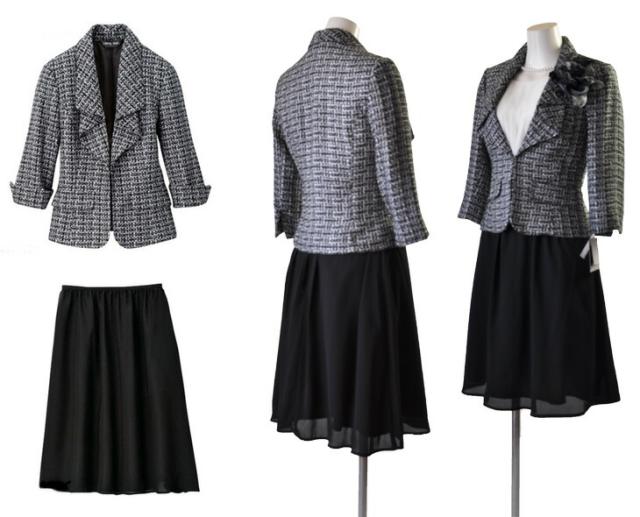 9号、11号、13号、15号、17号サイズのジャケット・ワンピース・スカートの3点スーツです。