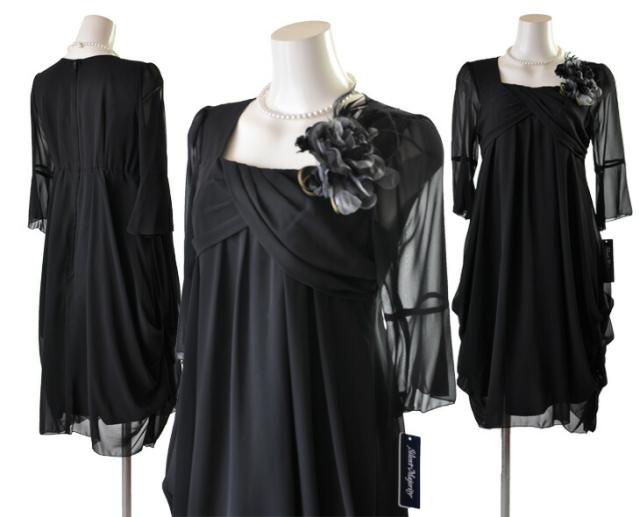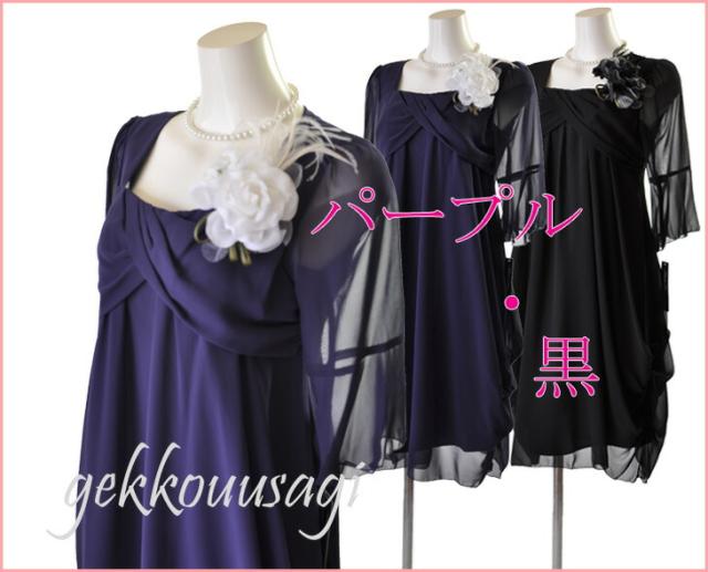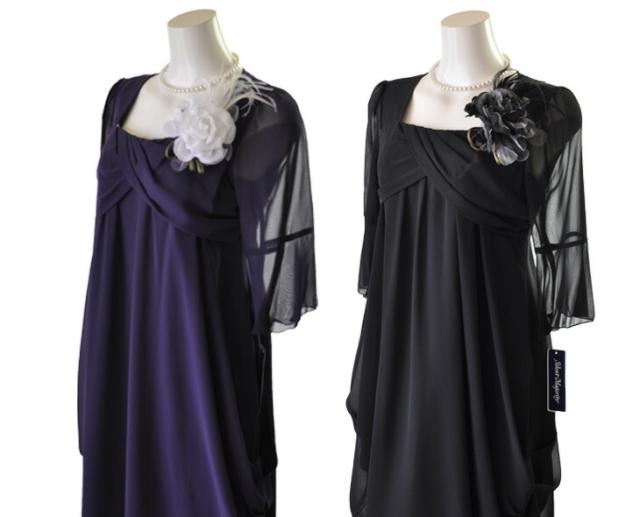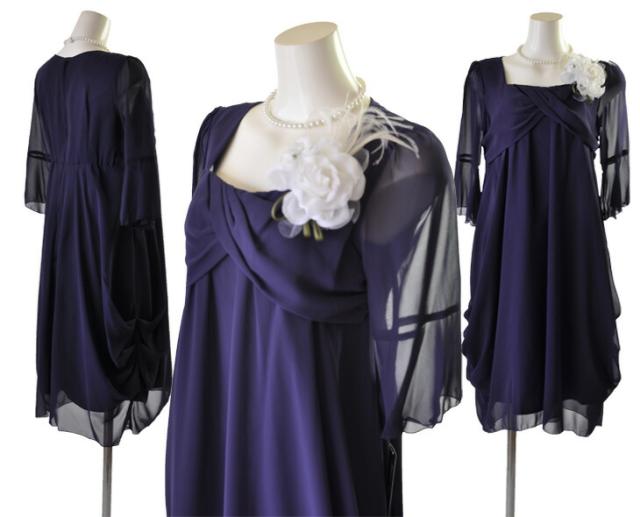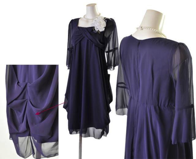 9号 11号 13号 15号 17号 ふんわり七分袖シフォンワンピース パーティー 結婚式 ドレス【黒・パープル・ネイビー】115-117