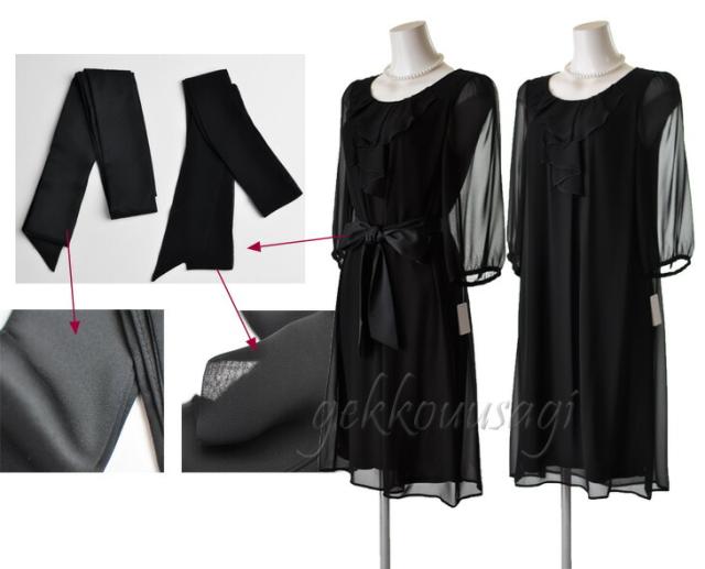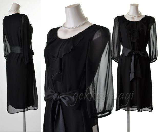 黒ワンピースは七分袖、薄手のシフォン素材。
