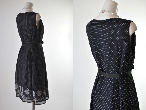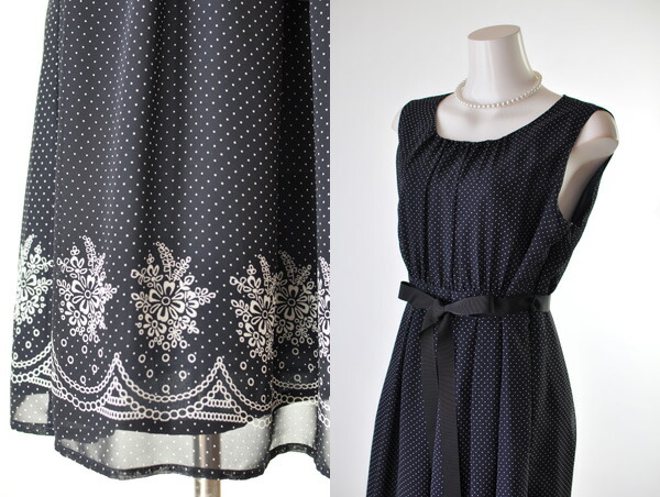 ワンピースは濃紺に小さめ白ドット柄ベースのデザイン。