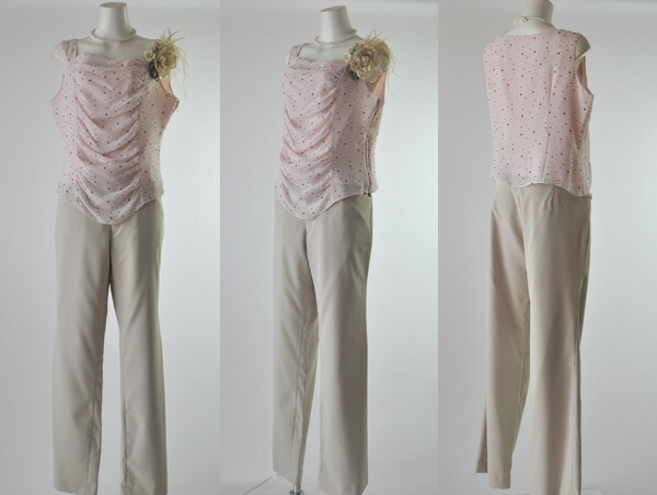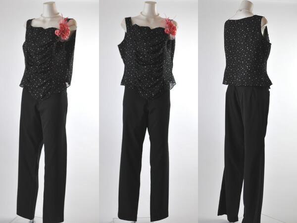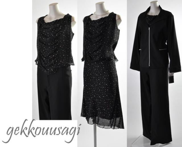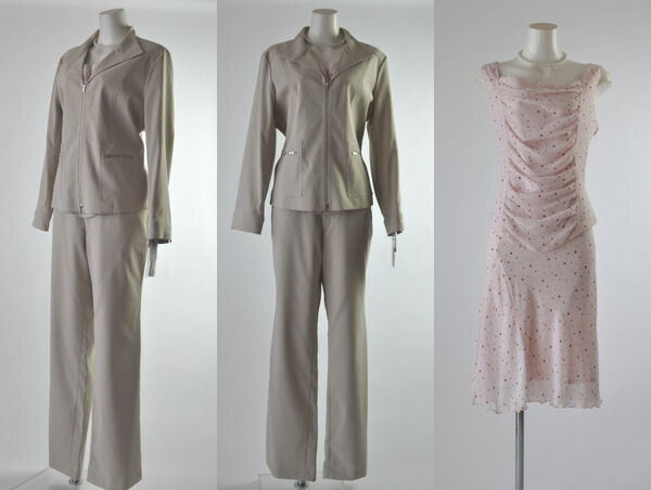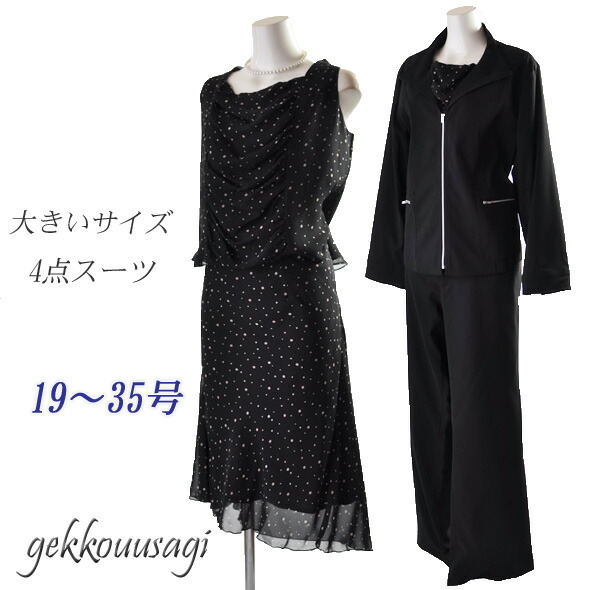 15号〜35号のジャケット、パンツ、ワンピース、スカートの4点セットスーツです。