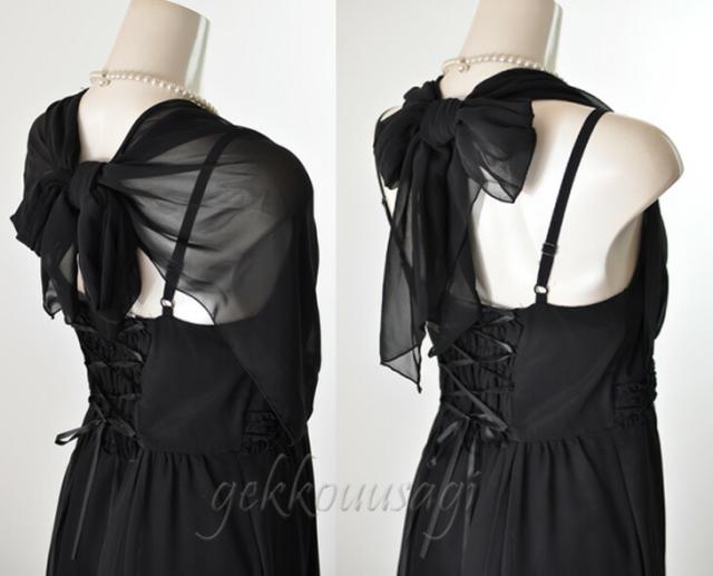 ウエストラインからのシフォン生地を首に巻き付けホルターネックドレスとしてお召しいただけます。