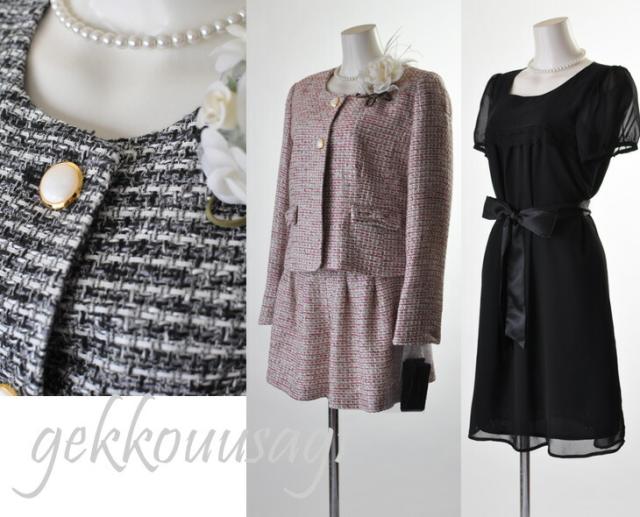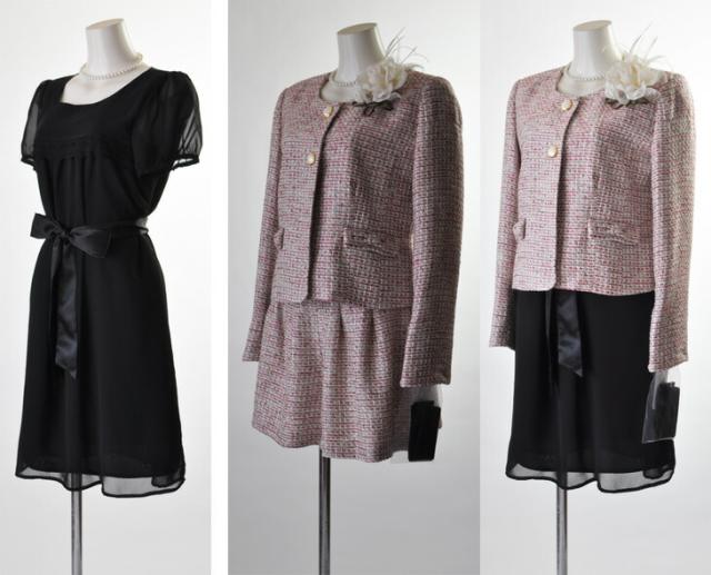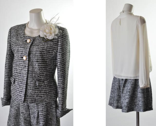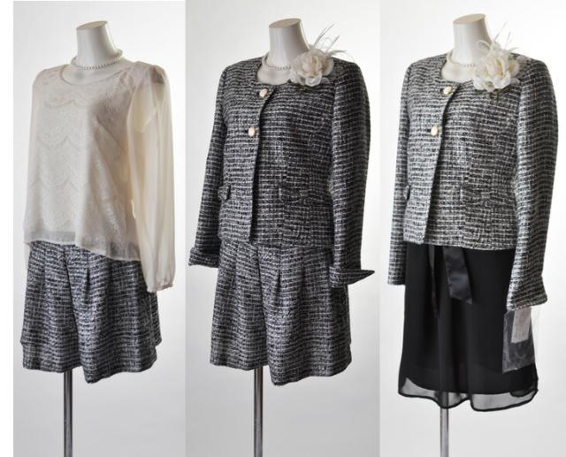 残りわずか9号/11号/13号 着回しツイード織り生地4点スーツ ノーカラージャケット・ブラウス・キュロット・ワンピース 七五三 卒業式 入学式 セレモニースーツ 【ブラック・ピンク】057(BL2F1Y3)