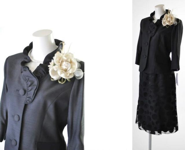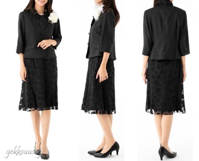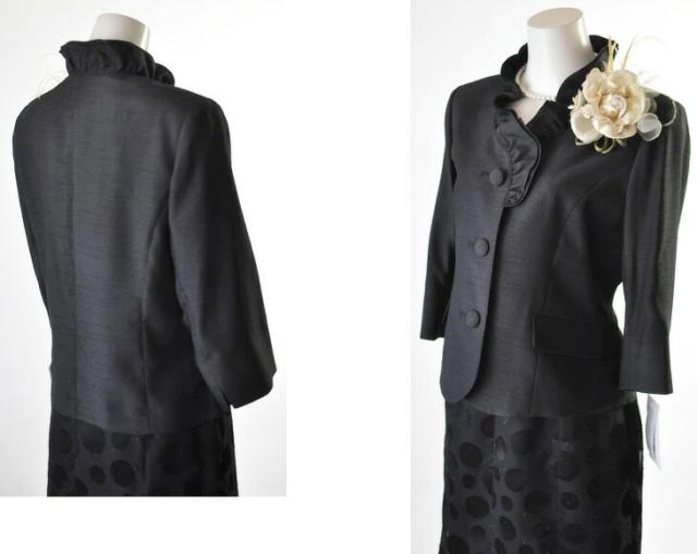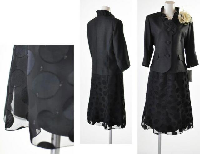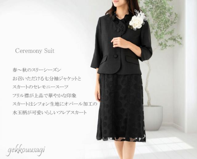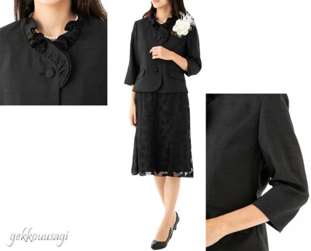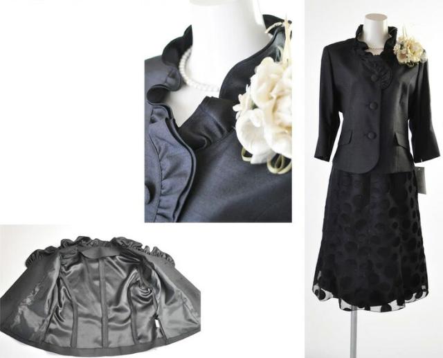 レディースフォーマル M L LL 3L 4L 5L 七分袖 フリル襟 ジャケット フレアスカートスーツ黒 結婚式 好印象 清潔感 黒・ネイビー 906 2141