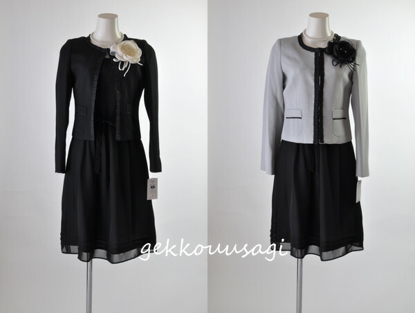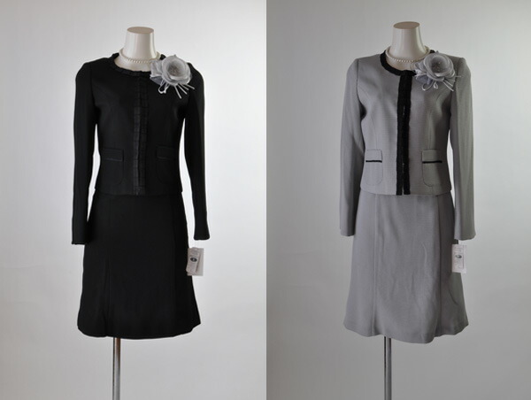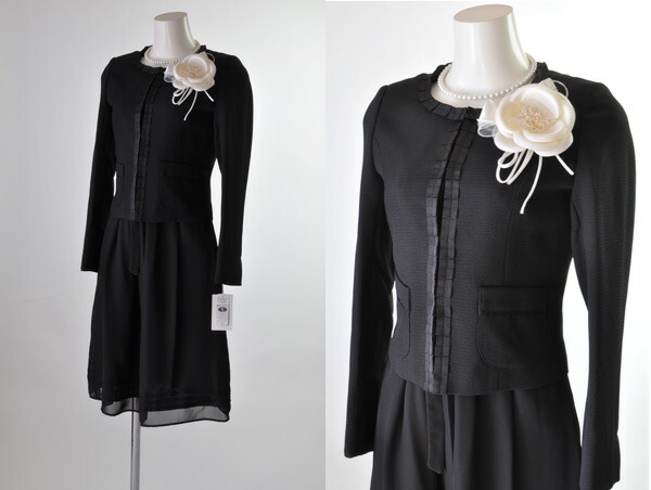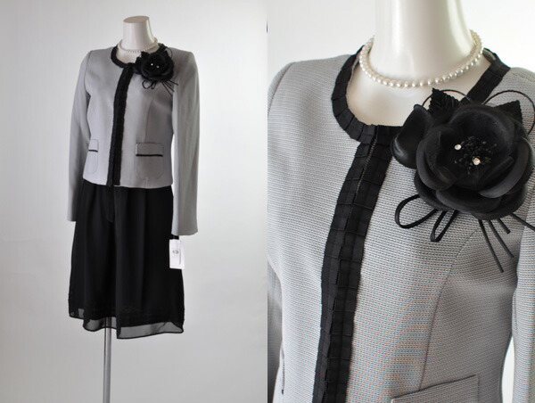 凛とした スカートスーツスタイル ティアード裾 可愛い ワンピース ノーカラージャケット3点スーツ 黒/グレー 卒業式 入学式 944