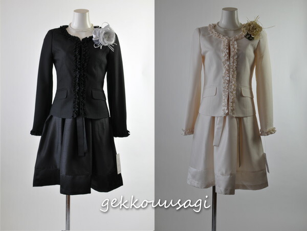 卒園式 スーツ 母親9号/11号/13号/15号/17号 大きいサイズ フリルジャケット&シャンタンワンピーススーツ カラーフォーマルスーツ 結婚式 お宮参り 入学式 卒業式 春秋 黒・オフ 273(b2f3y)