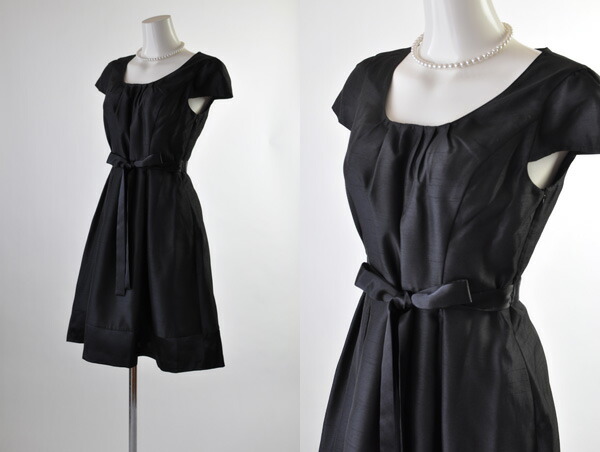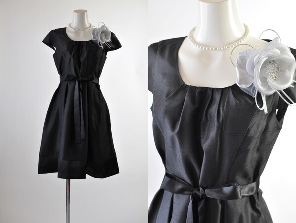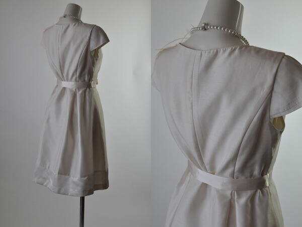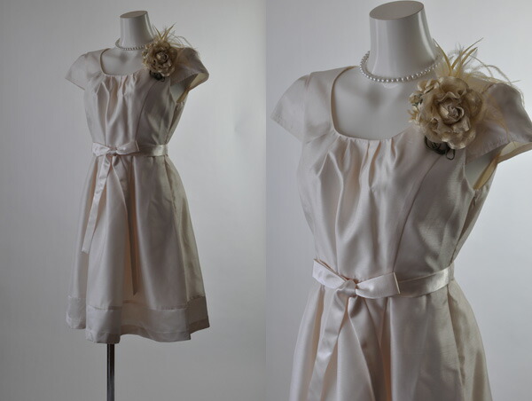 シャンタンワンピースはシルクのような素材感で、光沢感のある生地を使っています。 裾切替あり。 裾は本体より光沢感があります。 ウエストリボン(取り外しOK)で、さらにスタイルアップできます。 左ファスナー開きです。