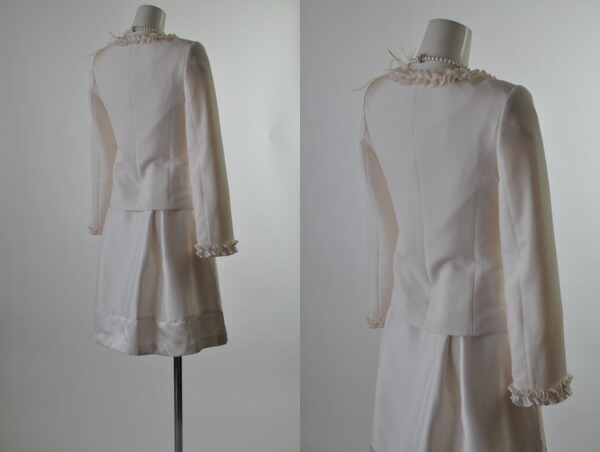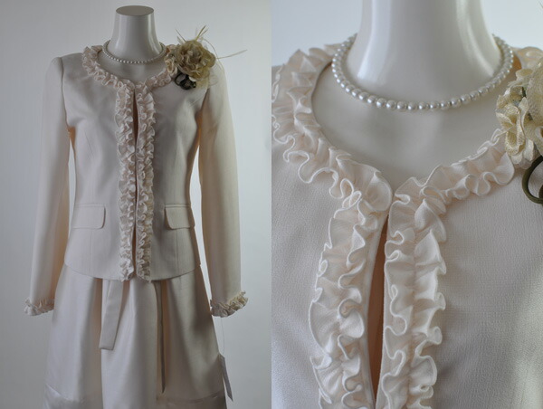 ジャケットは豊富なフロントフリルがフェミニン。 袖口のフリルも可愛いです。前合わせはホック留めですのでフリルの魅力を損ないません。 左右カバー付きポケットで全体的なバランスもアップしています。 肩パット入り。