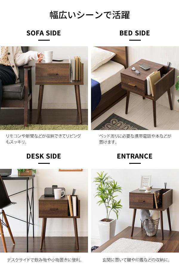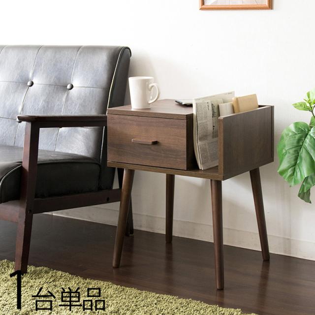マグカップや携帯電話が置ける天板、雑誌や新聞が出し入れしやすいフリーラックタイプのサイドテーブル。