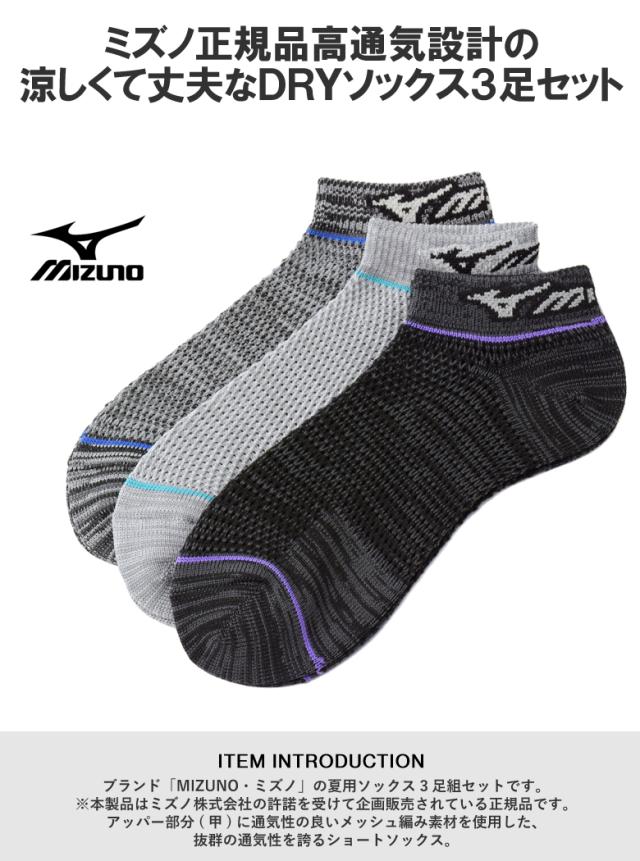 送料無料☆ミズノ正規品、高通気設計の涼しくて丈夫なDRYソックス3足セットです。
