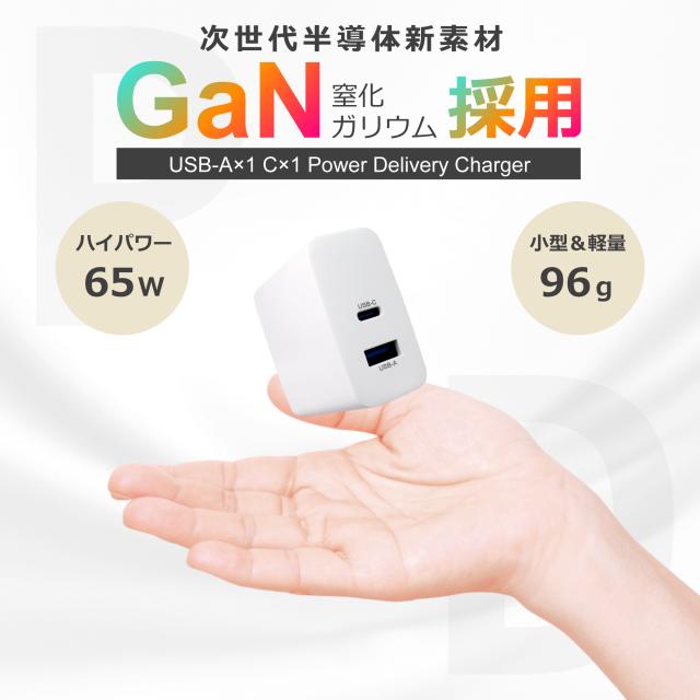 手の平に収まるコンパクトサイズで最大出力65Wの高出力充電が可能。