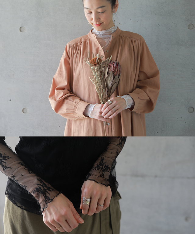 トップスのインナーとして合わせれば、袖口やネックからちら見えして可愛い。