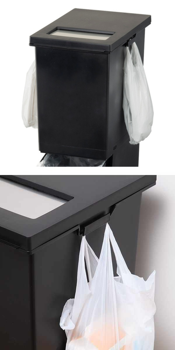 上段の左右には、レジ袋を掛けることができる便利なフックが付いており、上・下段と合わせて最大4分別が可能です。ペットボトルキャップ・紙パックなどの資源ごみまで細かく分別することができます。