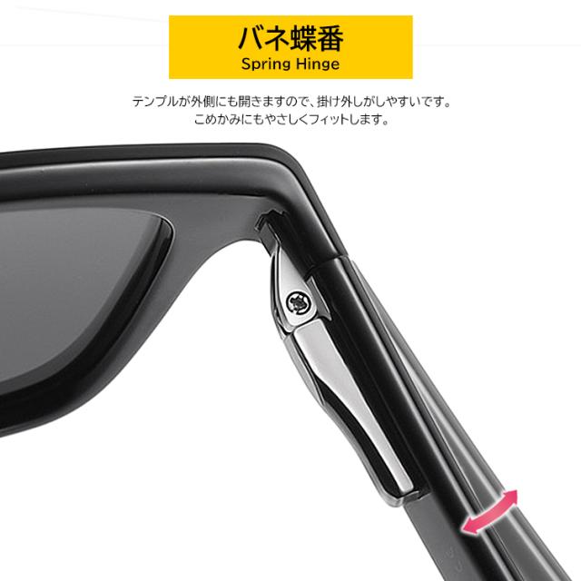 | 商品詳細 【 偏光サングラス】wan3398p スクエアシェイプのおしゃれなセルフレーム偏光サングラスです。 定番のグレー偏光から、おしゃれな グラデーションカラー偏光レンズまで6色をご用意。 ◇バネ蝶番 テンプルが外側にも開きますので、掛け外しがしやすいです。 こめかみにもやさしくフィットします。 【偏光サングラスの特徴】 車の運転、ドライブ中のフロントガラスの映り込み、路面の日差しの照り返しをカットし、 フィッシング、釣りで水面からのギラつきを抑え、水中の様子を見やすくし、目の疲労を軽減! 有害な紫外線(UV)も99%以上カットするので、紫外線対策として、ファッションアイテムとしても、もちろんお使いいただけます。 カラビナ付きのセミハードケースとメガネクロスがついているので、持ち運びにも便利です。 ギフトやプレゼントとしても最適です。ラッピングも無料対応中です。 | |