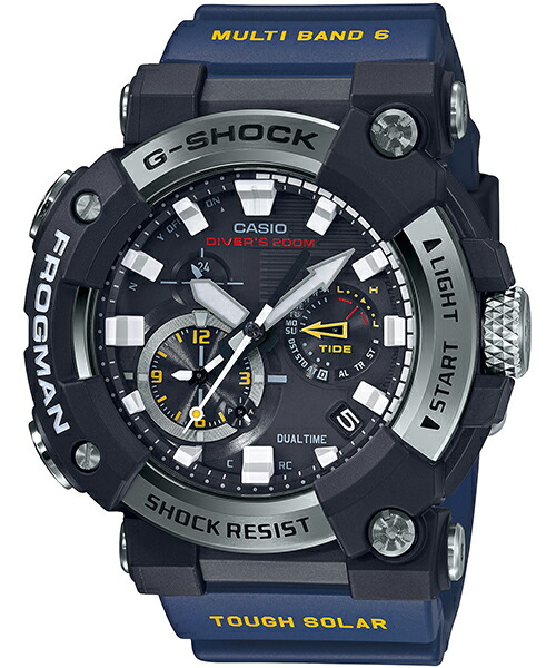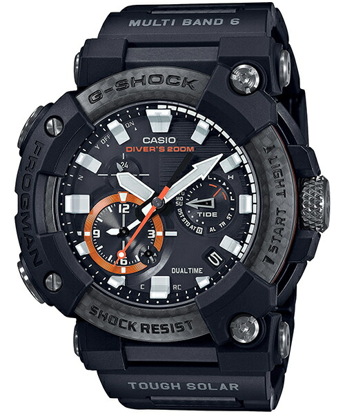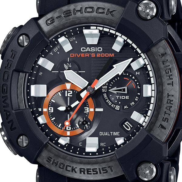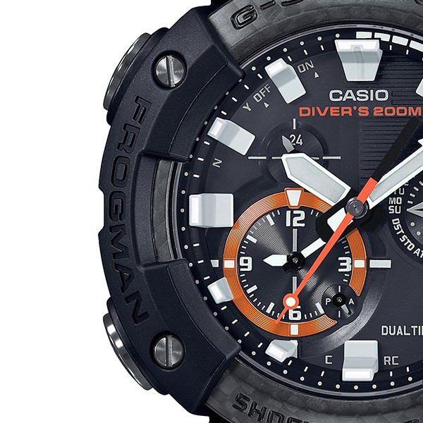 シリーズ誕生となる1993年から継承している左右非対称のフェイスデザインに、アナログ表示を実現したGWF-A1000は、大型の蓄光時分針により視認性も向上。カーボン繊維入りの強化樹脂は高い防水機能と強度を誇り、カーボンモノコックケースでISO規格200m 防水機能を実現しました。ベゼルに積層のカーボンを採用し一層だけをオレンジにすることで個性を演出し、文字板にもオレンジを差し色に使用。日常生活とダイビングシーンをシームレスに切り替えられるフロッグマンです。