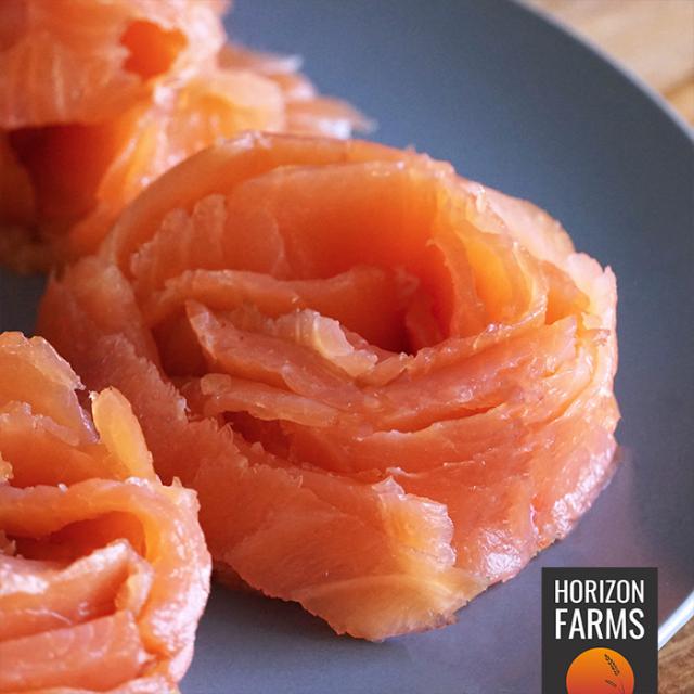 世界でも指折りの最高品質を誇る、タスマニア産の高級アトランティックサーモンを贅沢に使ったスモークサーモンをご用意しました。原材料となるサーモンを新鮮なうちに塩漬けした後、地元の果樹園の有機りんごの木を使いスモークしています。最低でも24時間、窯の中でじっくりとスモークすることにより、風味豊かでしっとりとした仕上がりになります。解凍後にスライスして、サラダやパスタに和えたり、前菜やちょっと贅沢なおつまみとしてお召し上がりいただくのもオススメな商品です。