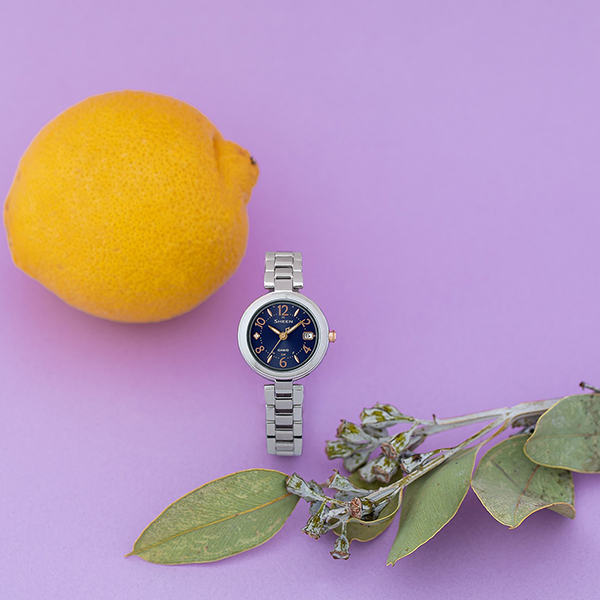 丸みのあるベゼルと一本足形状のメタルバンド採用により、上品でフェミニンな印象に仕上げた小型サイズのチタンモデルです。文字板にはアラビックインデックスと柔らかなフォルムのリーフ型インデックスを採用し、視認性にもこだわりました。また、9時側のクリスタルの輝きがアクセントになっています。ケースサイズはH31.5mm /W25.6mm、質量は31gと使い心地の良い小型モデルです。バンドカラーはシルバーを採用しました。機能面では、日本と中国の標準電波受信機能やタフソーラー、日付表示などを搭載し、利便性も兼ね備えています。更に傷付きにくく、高硬度の反射防止コーティングサファイアガラスを採用。軽量で日常生活に使いやすく、煌めくデザインの電波ソーラーウオッチです。