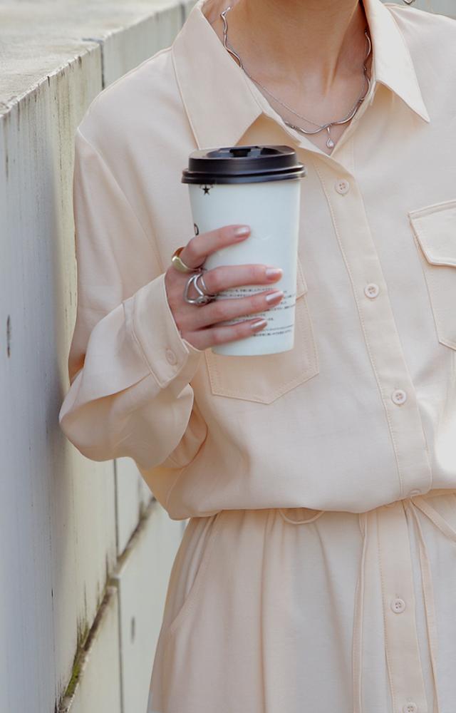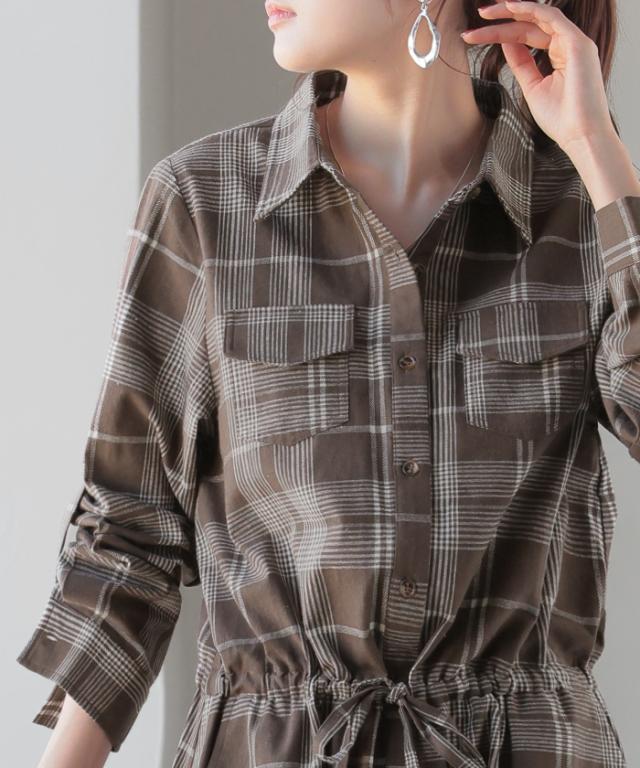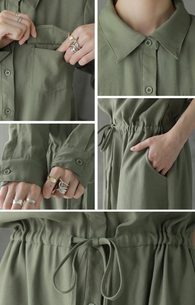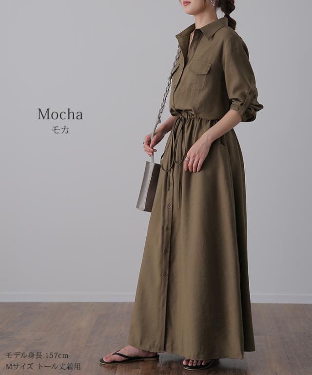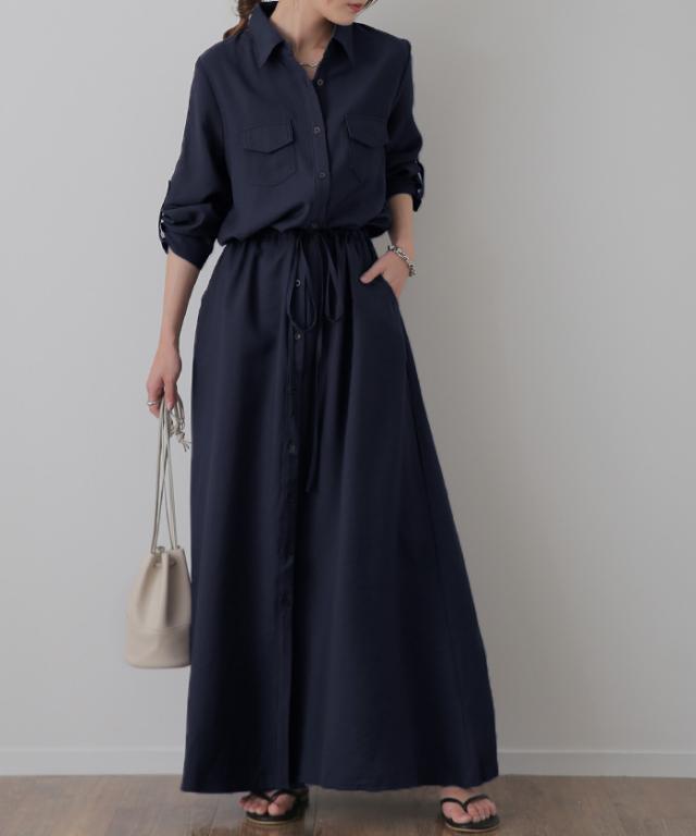 胸もとにフラップポケットをあしらったサファリテイストのロングシャツワンピース。