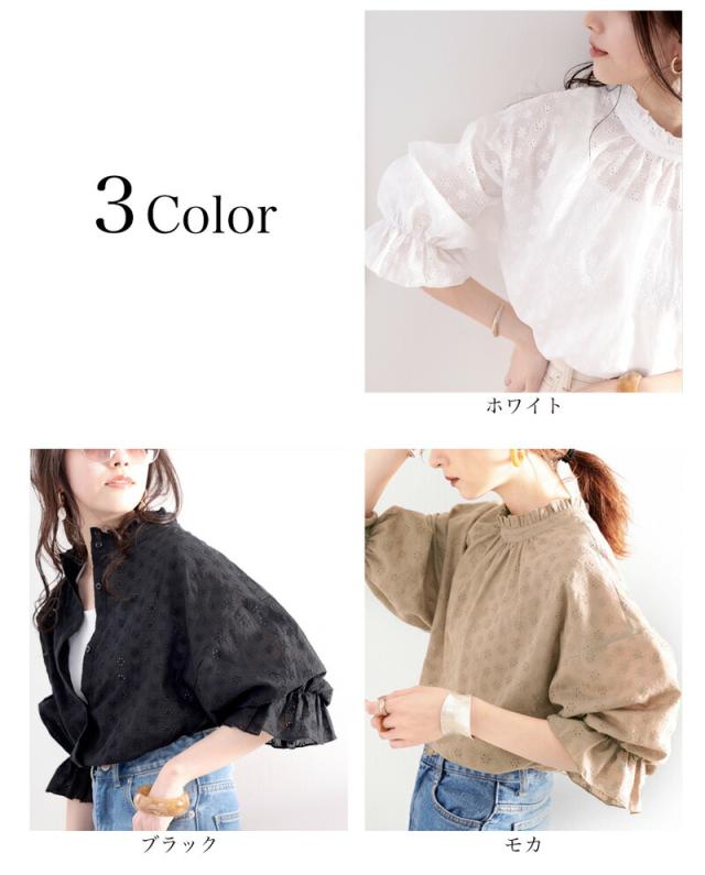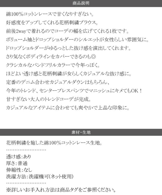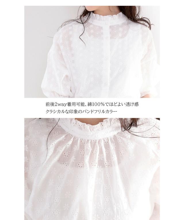 春新作 クラシカルエルフ レディース 体型カバー 大きいサイズ トップス ブラウス 前後2way フラワー刺繍 レース ボリューム袖 ホワイト ce1010023