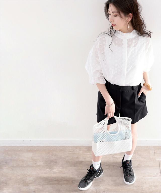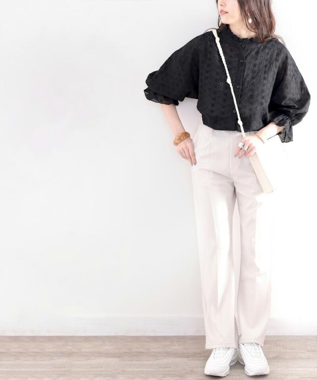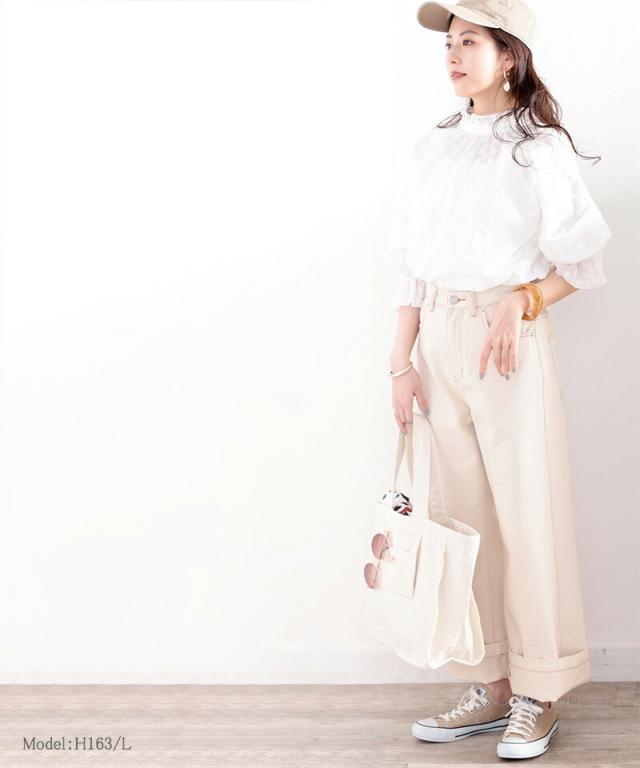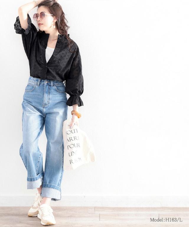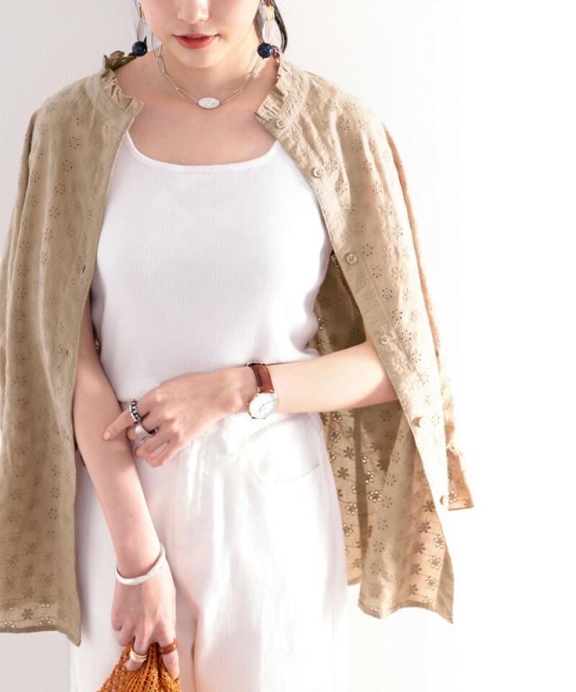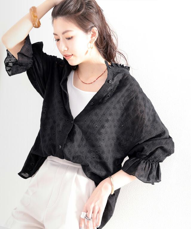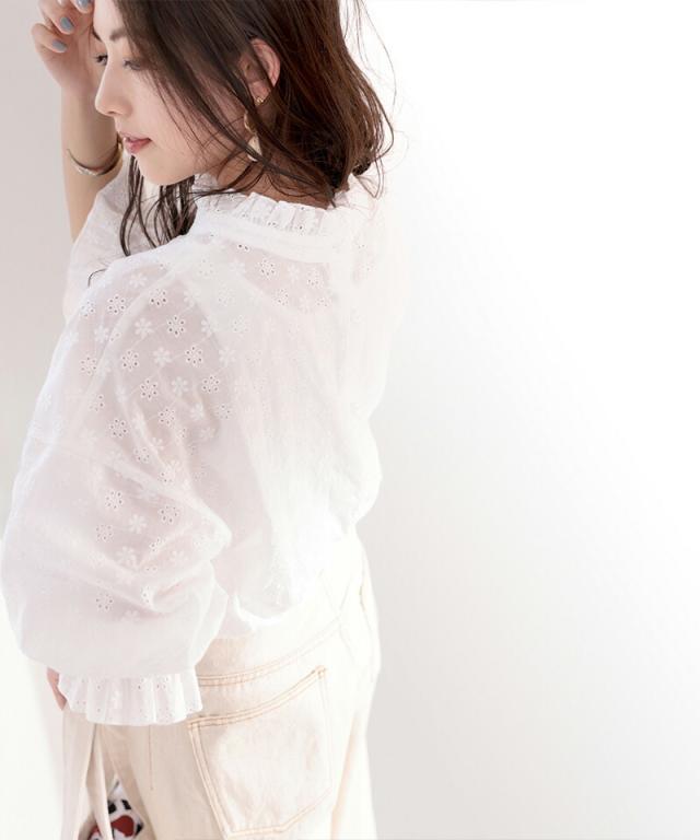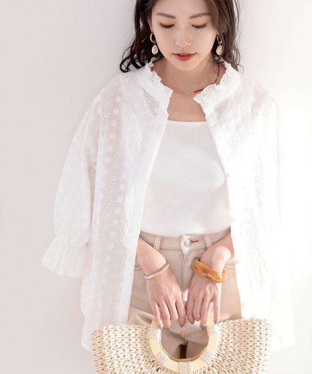ほどよい透け感と花柄刺繍が女らしくカジュアルな抜け感に。