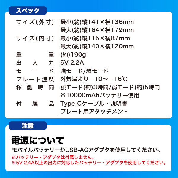 - より見た目良く携帯性を上げるためか充電式の物が多いですが、私は長時間の使用が大事なのであえて携帯バッテリーに繋ぐタイプを購入しました。20,000mAhもあれば8時間強で持ちました。