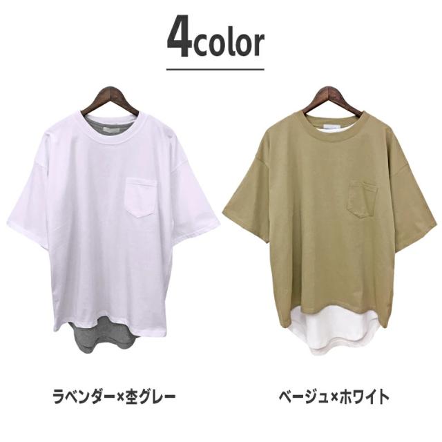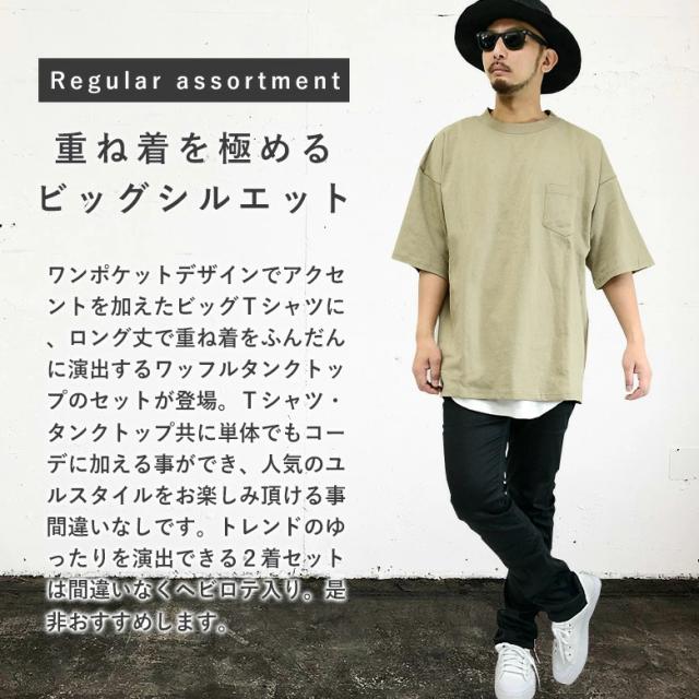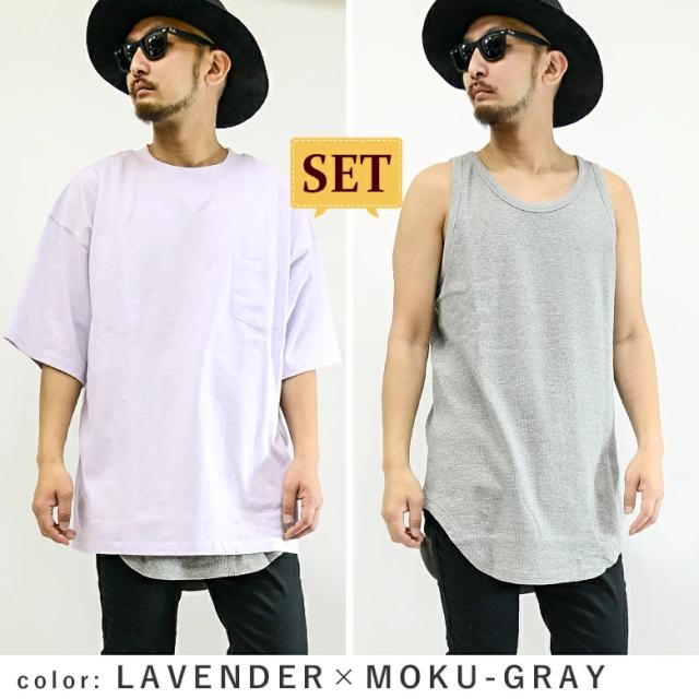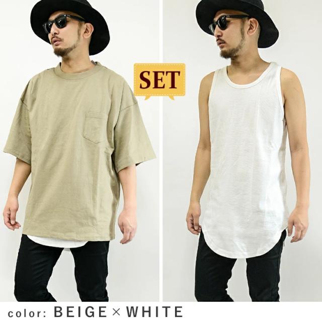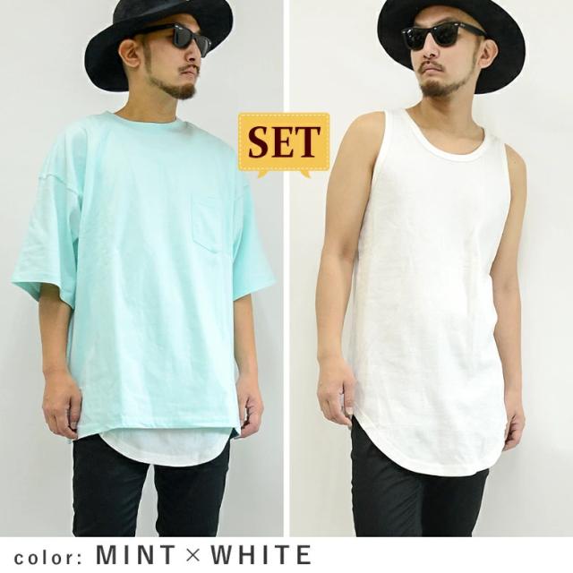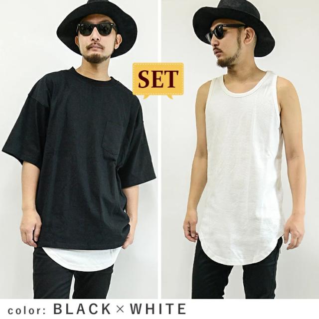 【閉店セール】ビッグシルエットポケット Tシャツ &ロング丈タンクトップ2枚セット70522 70382メンズTシャツ カットソー タンクトップ アンサンブル 2着セット 半袖Tee 無地 ポケットT ビッグシルエット ゆったり ロング丈 韓国ファッション 部屋着 ルームウェア