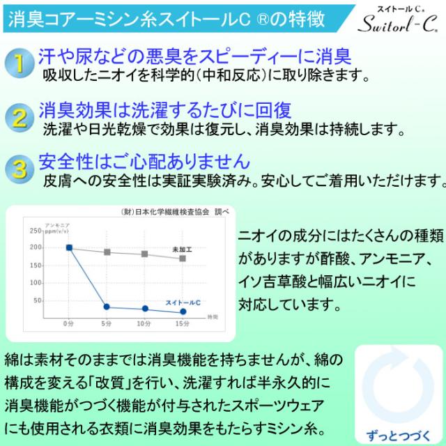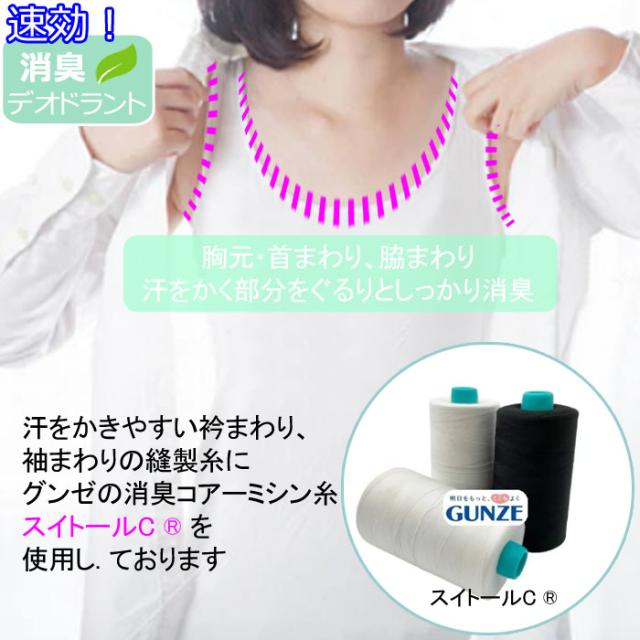 ●首周り・腕周りの汗が気になる部分に消臭糸を使用しています。気になる汗の匂いも徹底的にカット