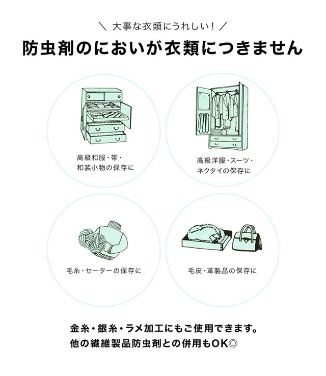 着物だけでなく、絹製品、洋服、毛皮、革製品、ラメ加工品などの乾燥・防虫剤としてもご利用いただけます。